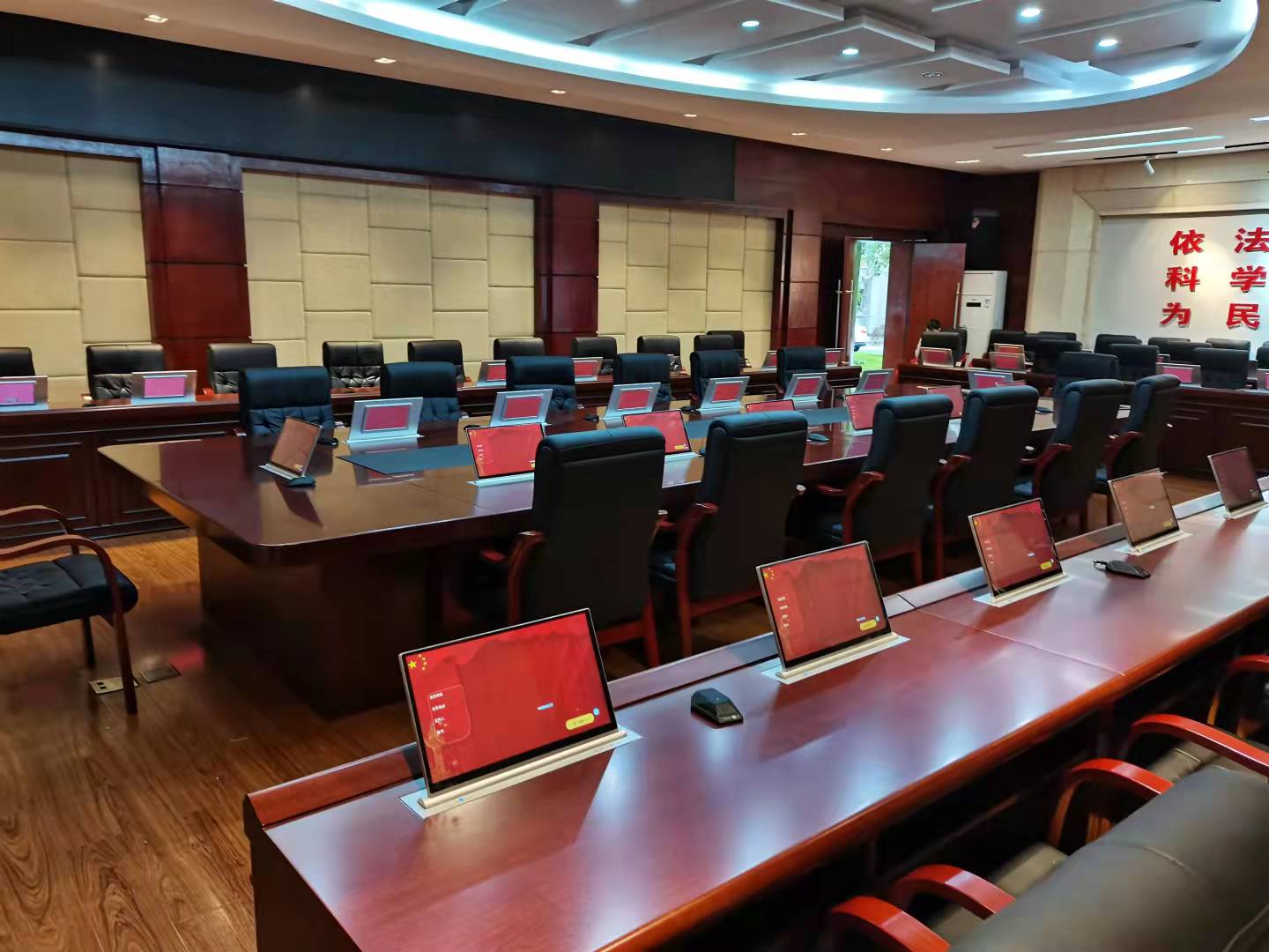 武胜县人民政府办公室无纸化智慧会议系统所涉及系统:交互式无纸化会议系统、可编程中央控制系统、远程视频会议系统、音箱扩声系统、界面话筒(其中无纸化会议系统采用超窄边双面屏、国产兆芯CPU、银河麒麟软件)